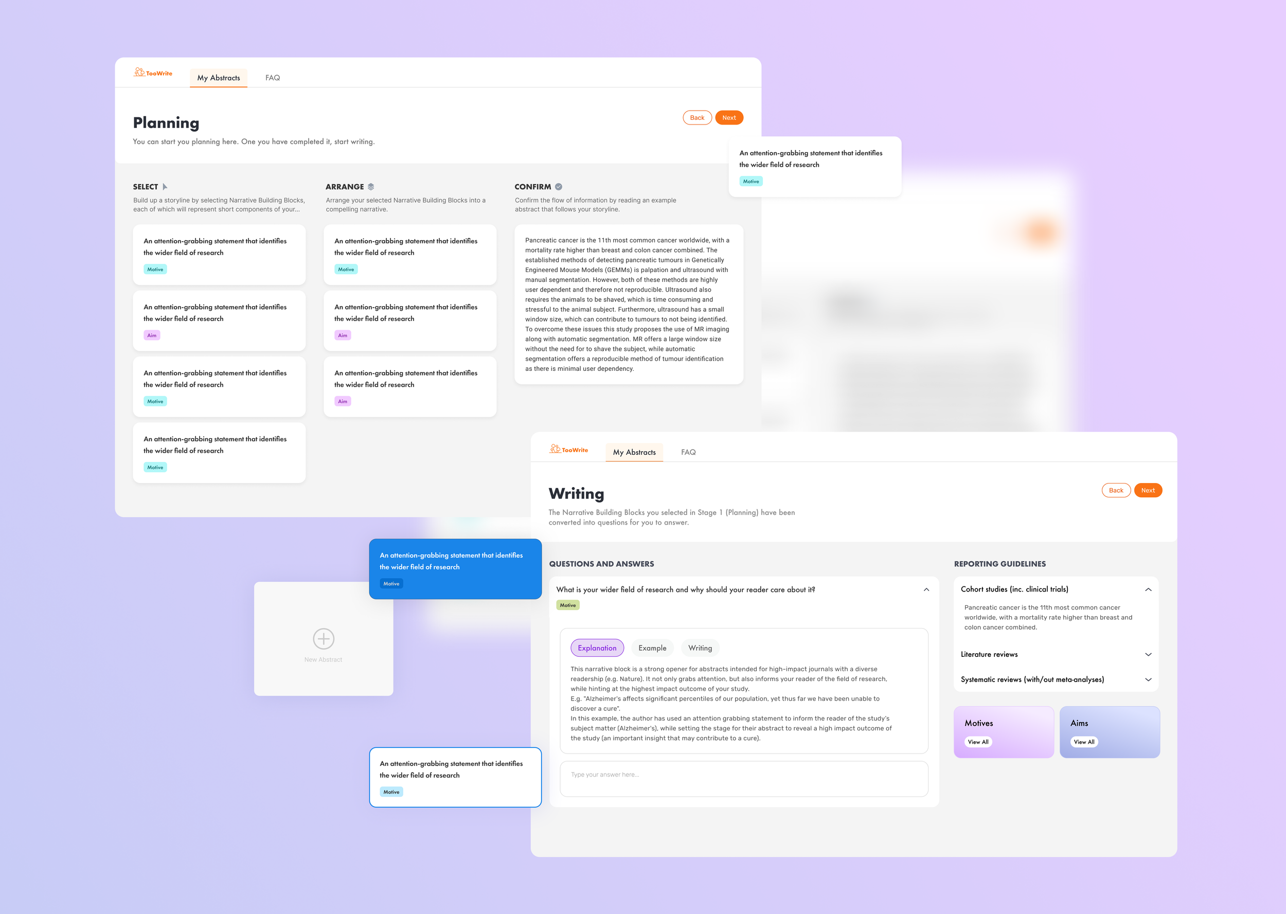 TooWrite is built on the premise that scientific writing follows recognisable patterns. However, many researchers associate good writing with originality and personal expression. The core design challenge was to present structured guidance in a way that felt enabling rather than limiting. This required careful iteration of language, framing, and interaction patterns to ensure users experienced the framework as a tool for clarity rather than constraint.